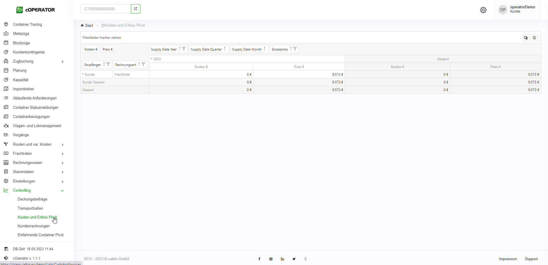 Den Bereich „Kosten und Erlöse“ finden Sie im Menü unter „Controlling“. Dort können Sie sich Ihre entstandenen Kosten und Ihre abgerechneten Preise für einen ausgewählten Zeitraum anzeigen lassen. Diese Auswertung können Sie sich dann z.B. nach Kunden sortiert anzeigen lassen.
