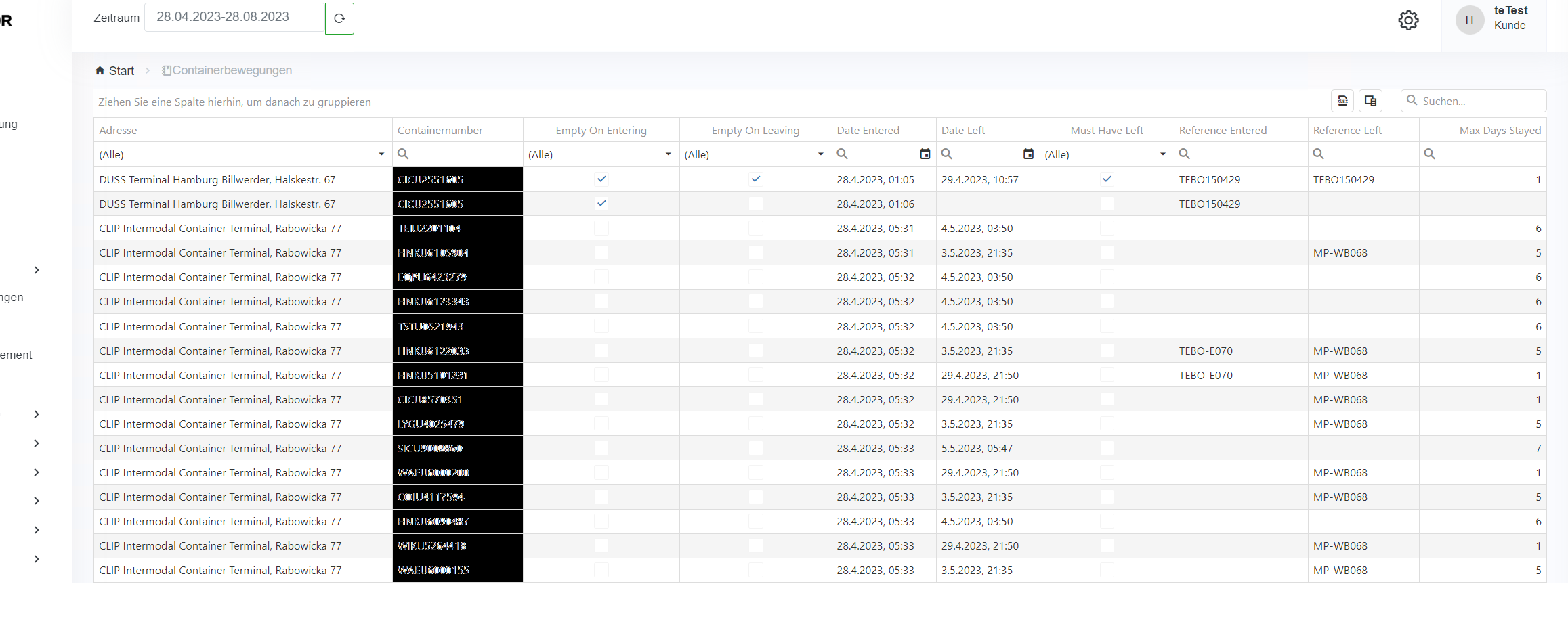 Die Containerbewegungen finden Sie im Menü unter „Containerbewegungen“. Dort werden alle Bewegungen einer Ladeeinheit an verschiedenen Standorten aufgeführt, die über eine vorhandene Schnittstelle gemeldet werden.