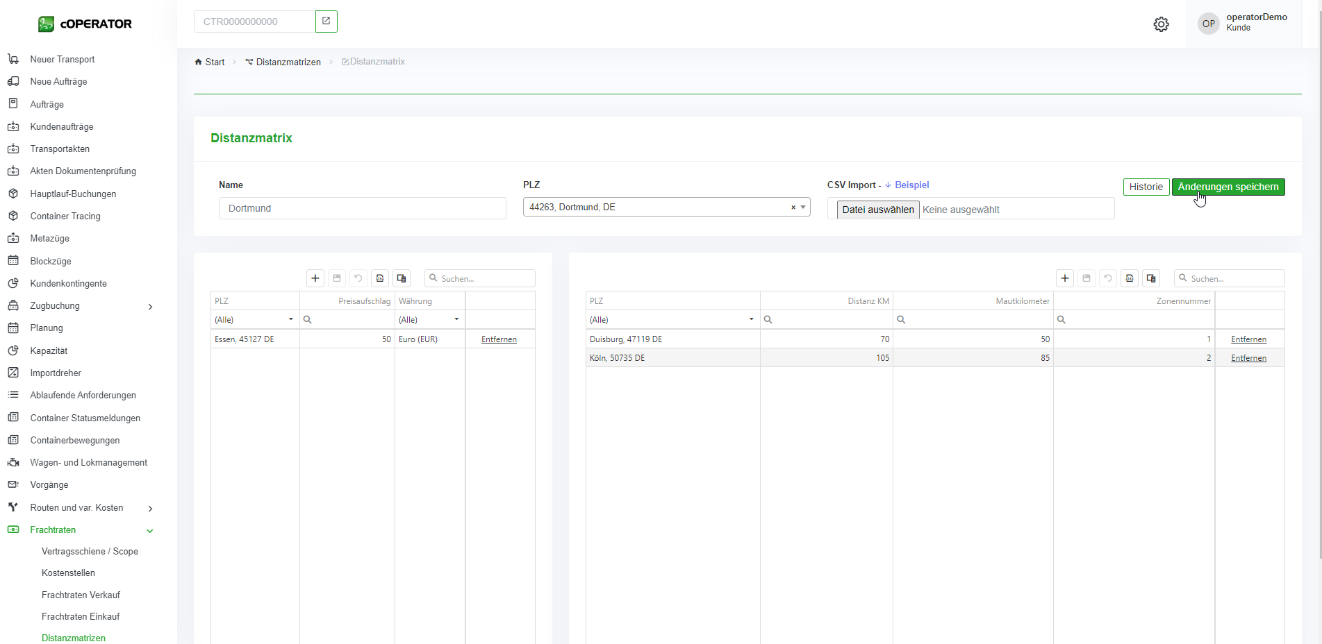 Die Distanzmatrizen finden Sie im Menü unter „Frachtraten“. Sie gelten als Basis für die Preisberechnung aller Aufträge. Der schnellste Weg ist der Import Ihrer Distanzmatrix als CSV Datei.