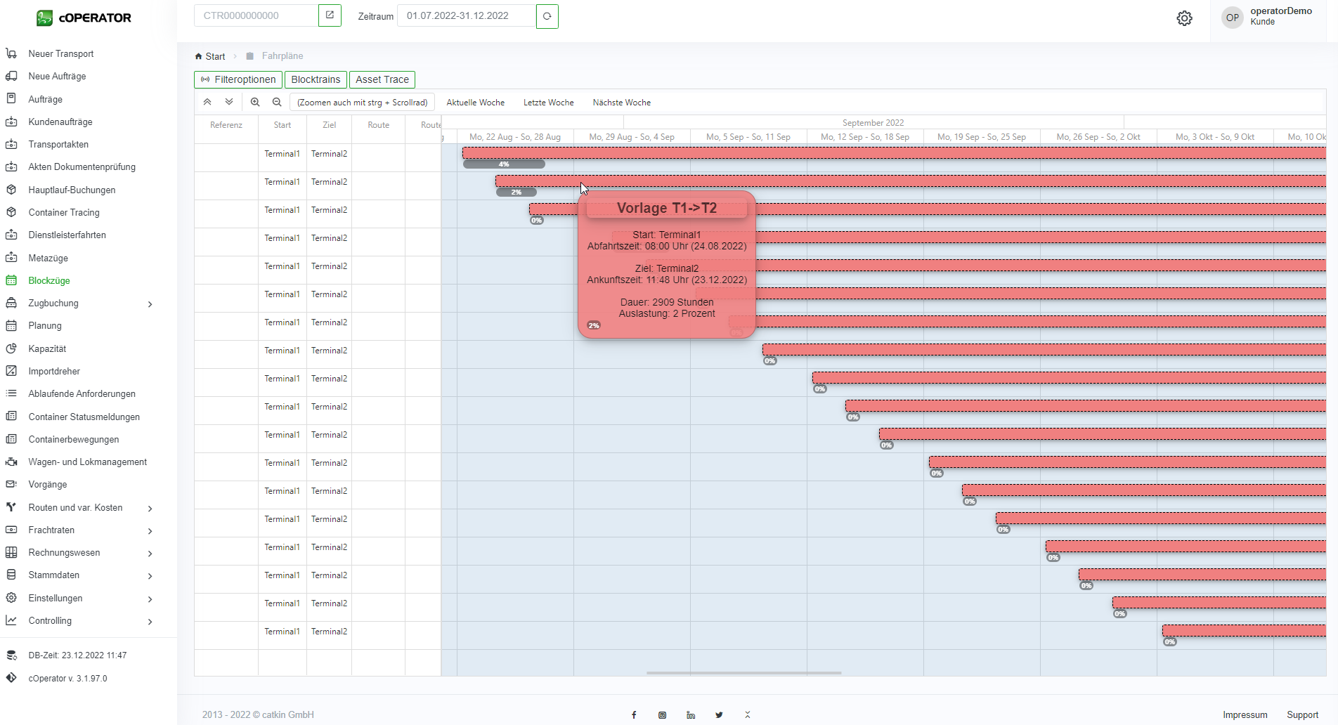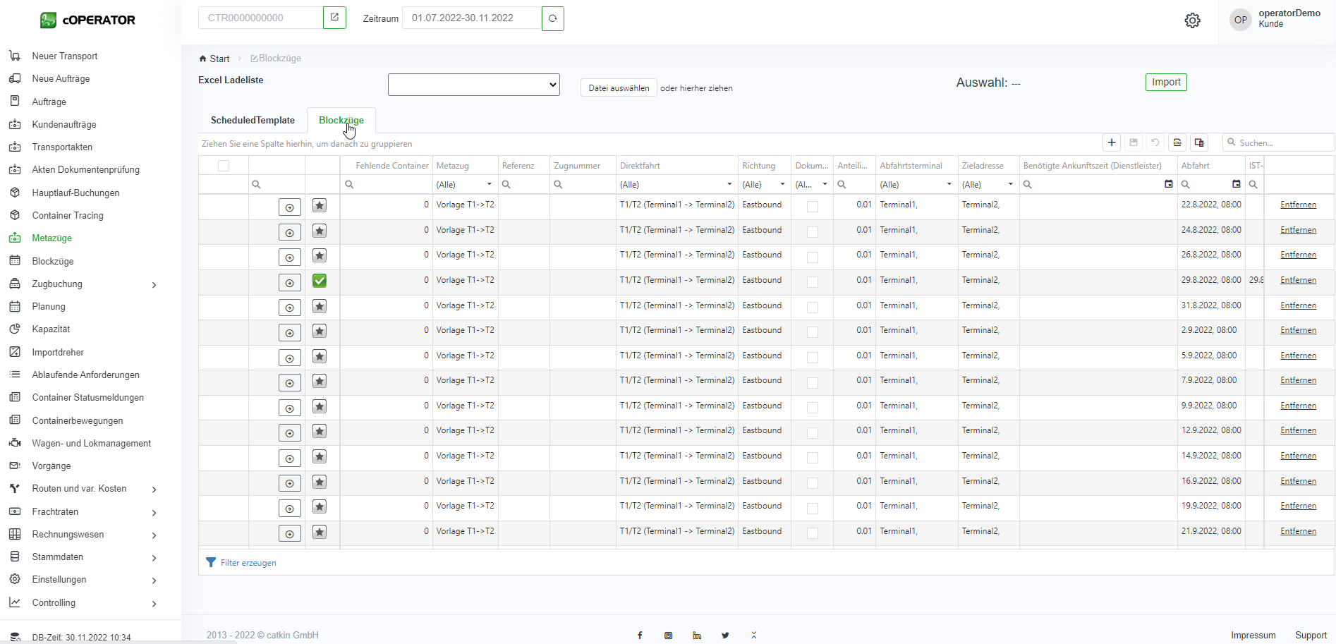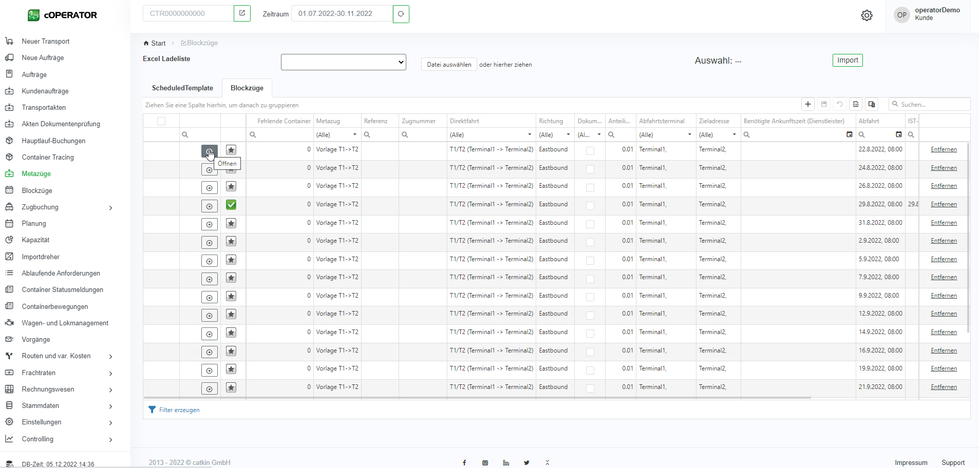 In der Liste werden alle Blockzüge mit entsprechenden Informationen wie z.B. Abfahrtsterminal, Ankunftsterminal, Plan und Ist-Zeiten und welcher Metazug zu Grunde liegt, angezeigt.