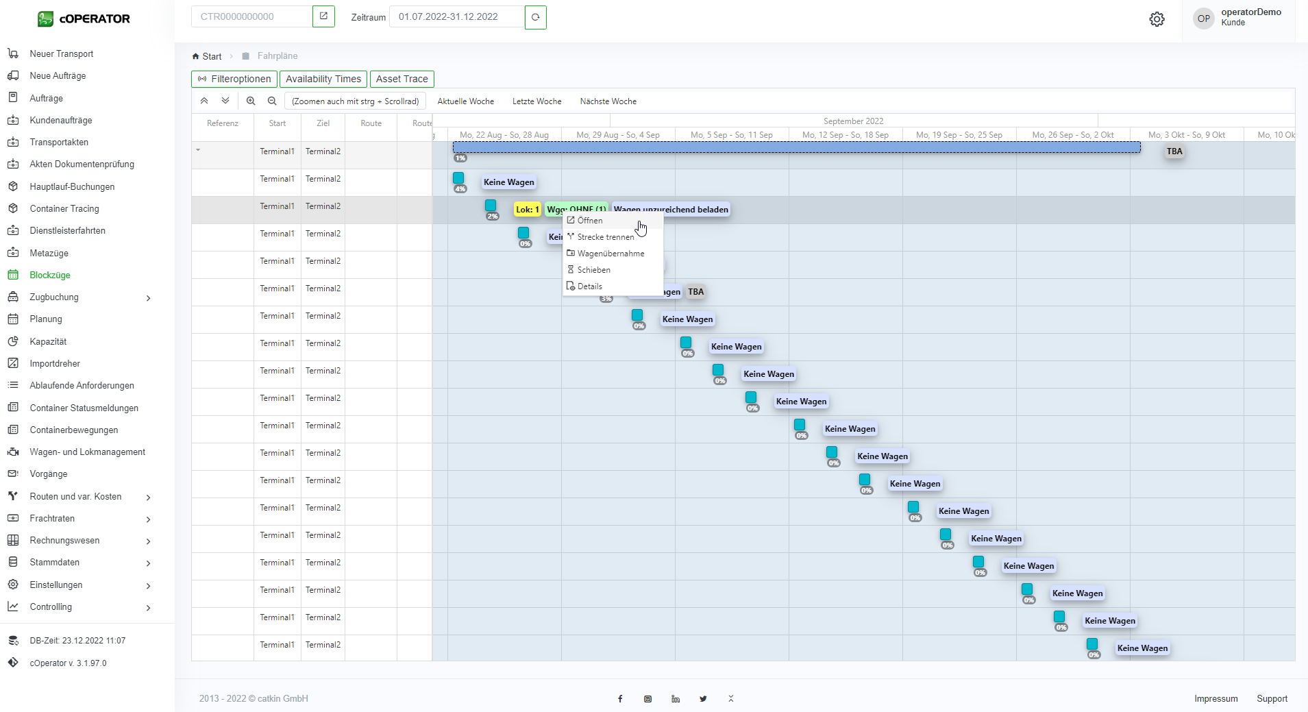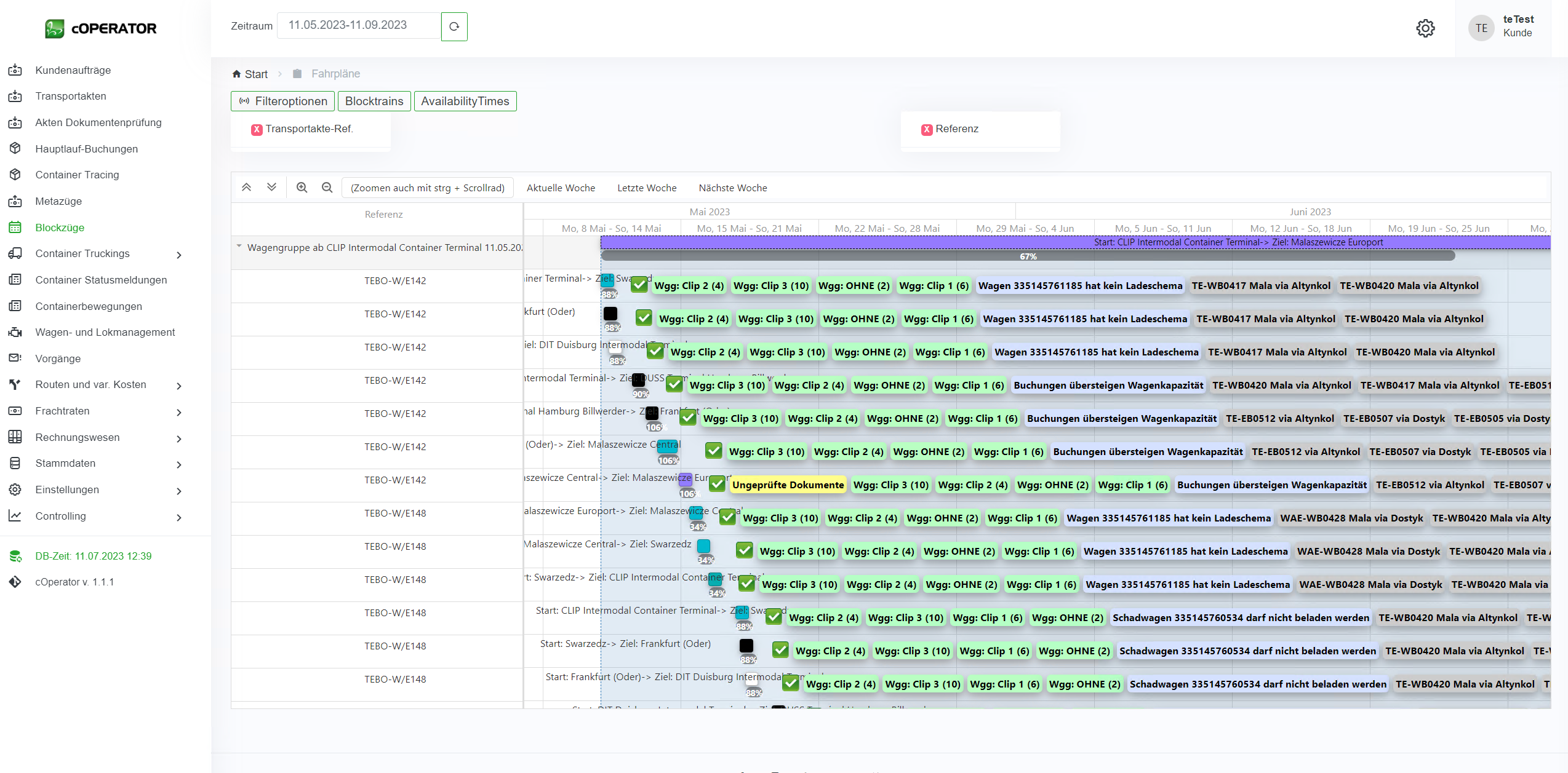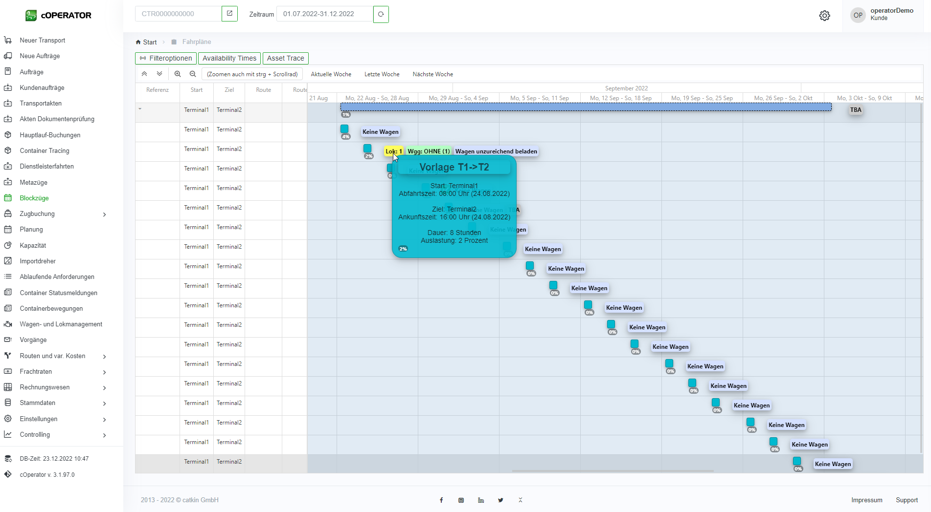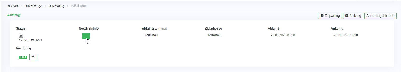 In der Liste werden alle Blockzüge mit entsprechenden Informationen wie z.B. Abfahrtsterminal, Ankunftsterminal, Plan und Ist-Zeiten und welcher Metazug zu Grunde liegt, angezeigt.