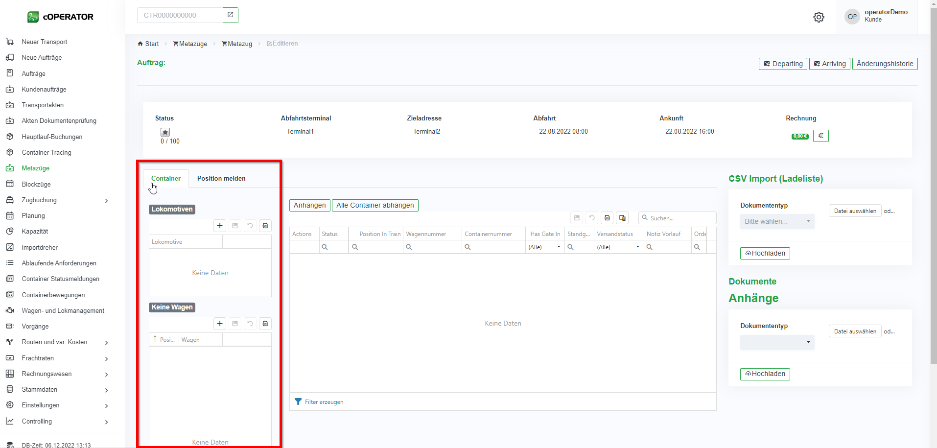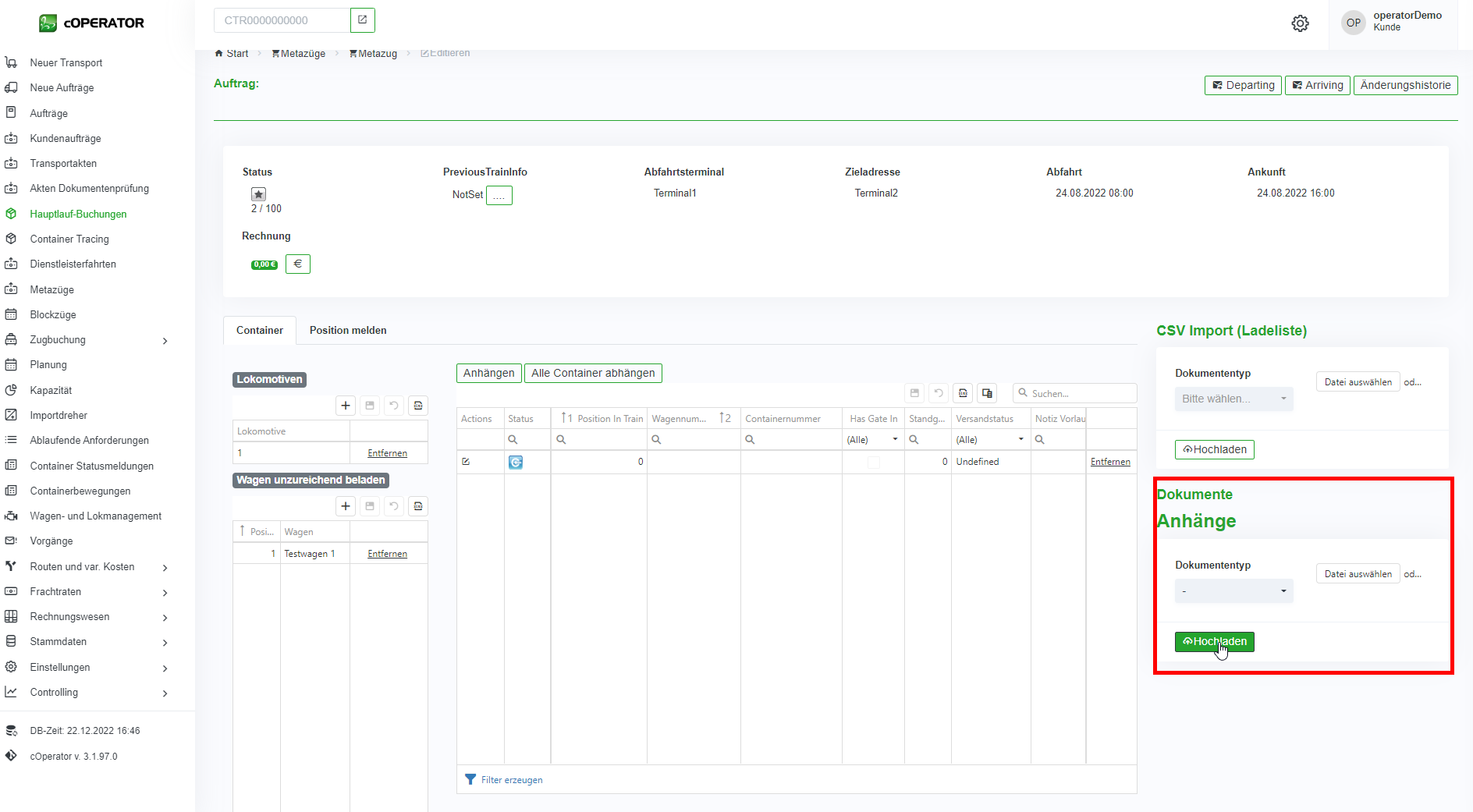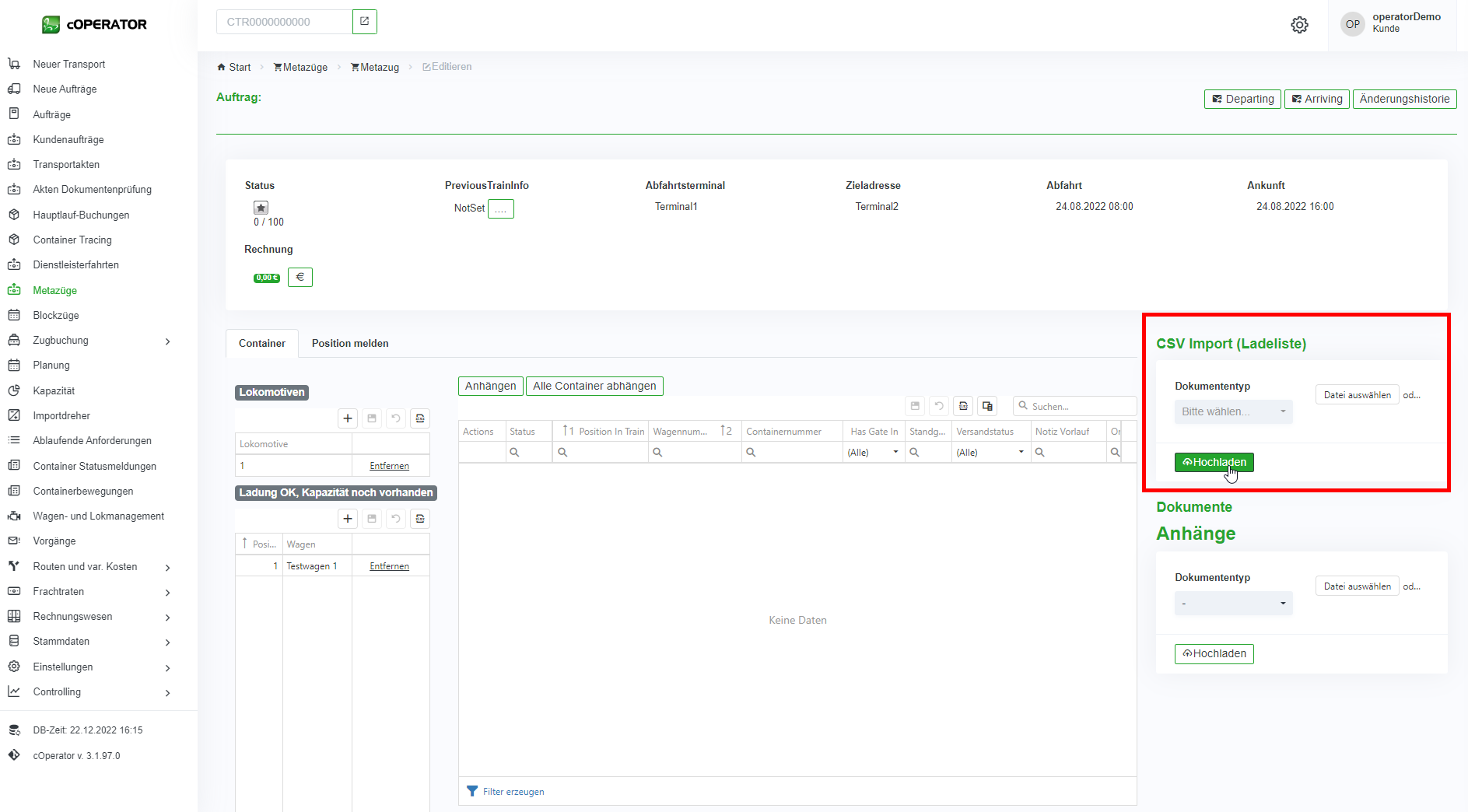 1. Über den CSV Import einer Ladeliste, lassen sich direkt alle Container in das System und auf den Blockzug verplanen (vgl. Abbildung 8‑11). Dafür wählen Sie die entsprechende Datei aus und laden Sie diese direkt in dem System hoch.