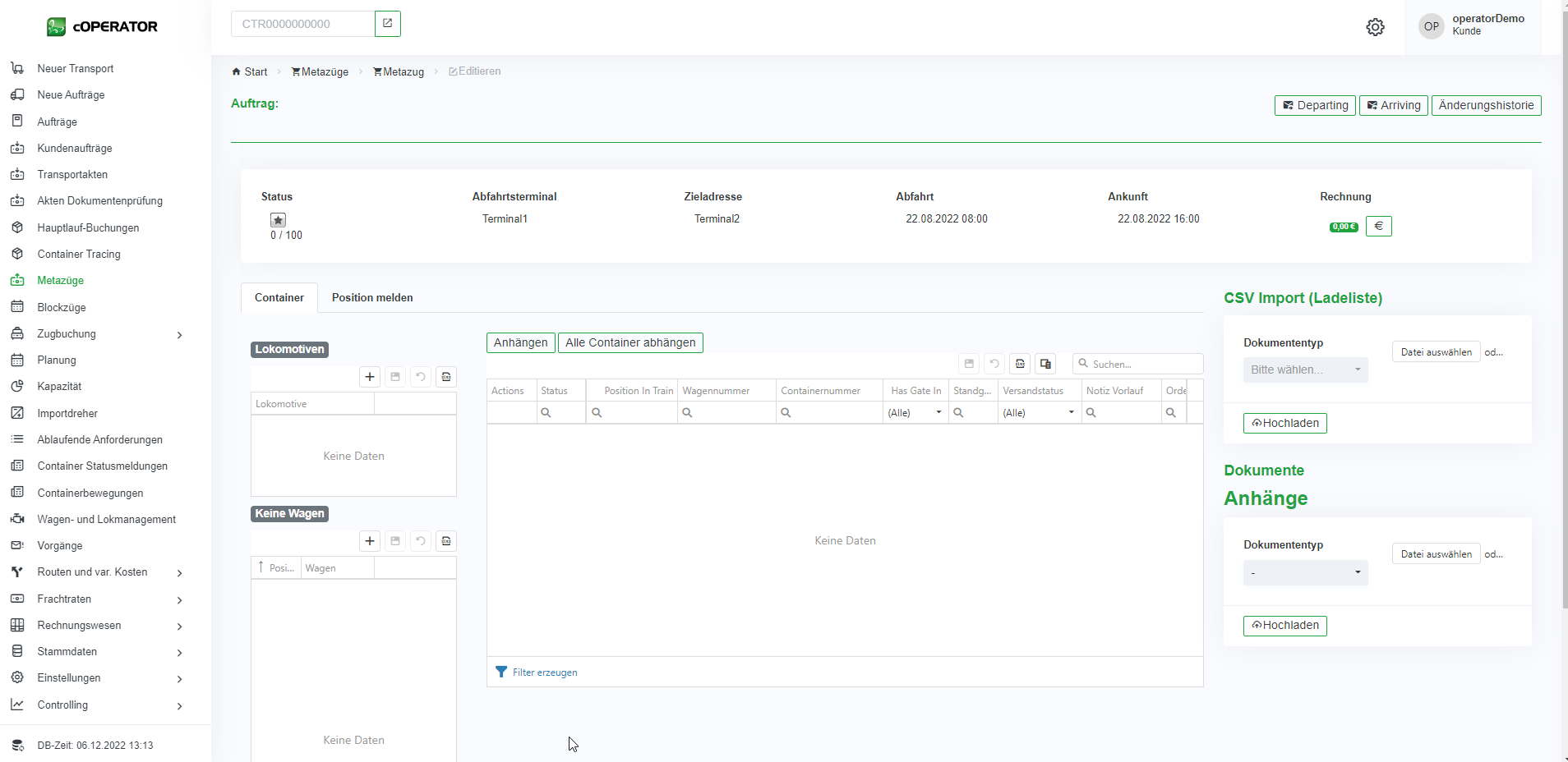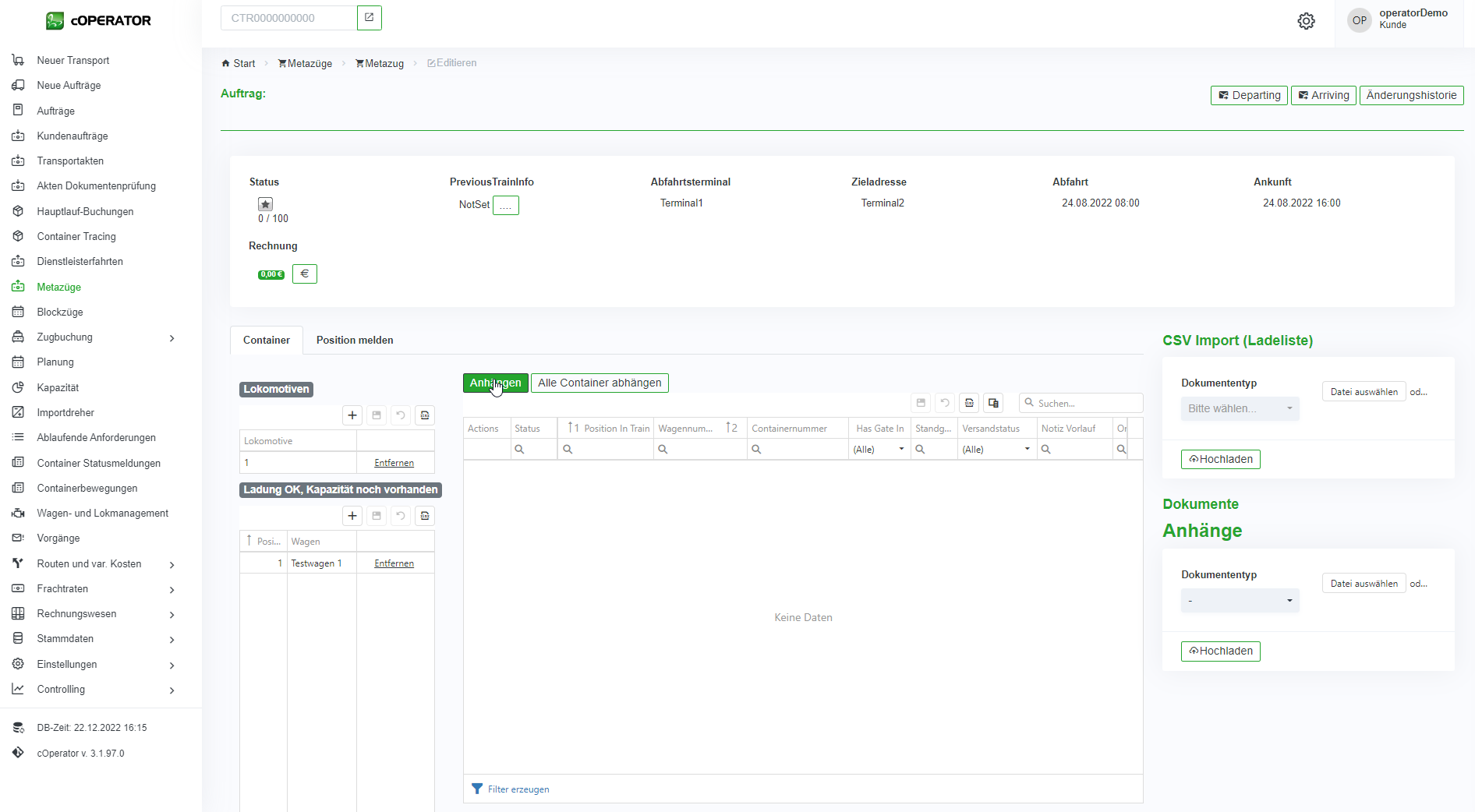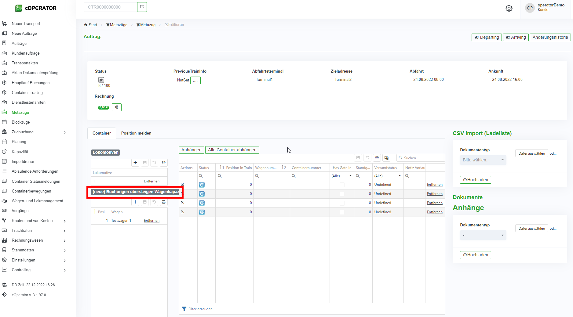 1. Über den CSV Import einer Ladeliste, lassen sich direkt alle Container in das System und auf den Blockzug verplanen (vgl. Abbildung 8‑11). Dafür wählen Sie die entsprechende Datei aus und laden Sie diese direkt in dem System hoch.