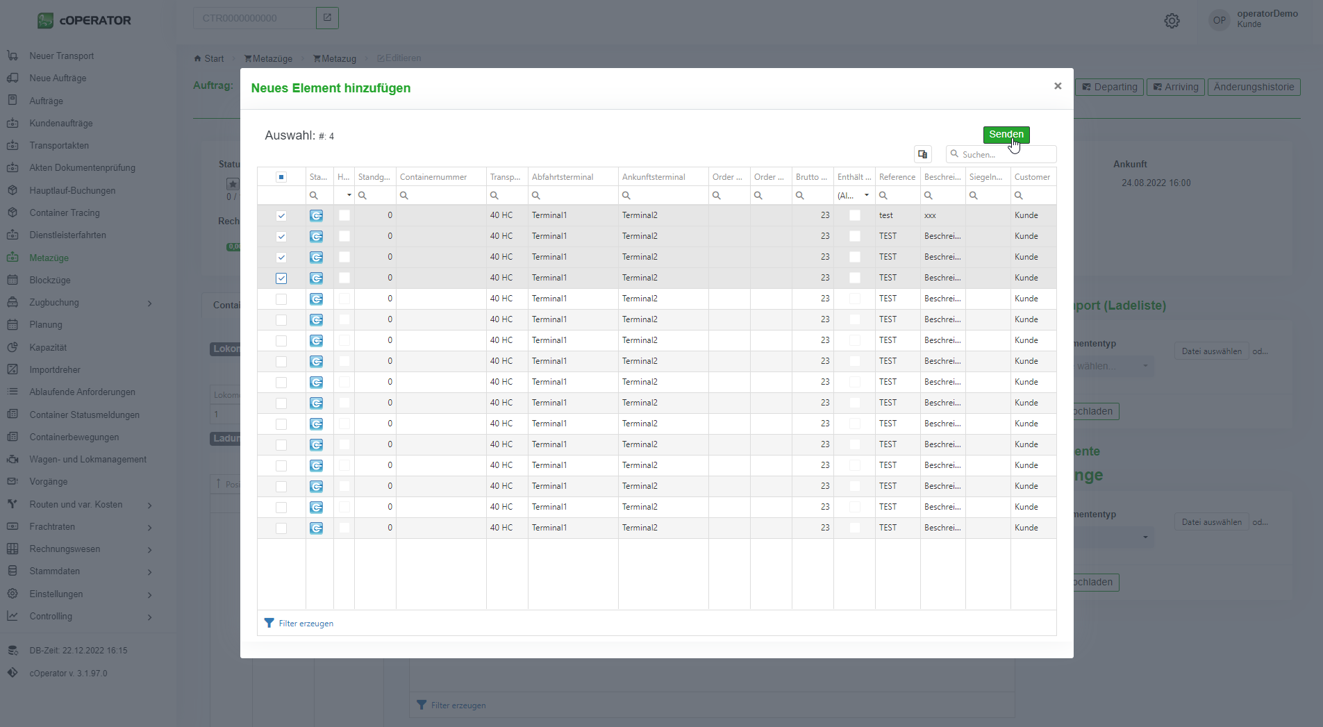 Über das Auswahlmenü lassen sich manuell Container auswählen und über den Button „Senden“ (vgl. Abbildung 11.8‑13) dem Blockzug hinzufügen. Diese werden dann in der Übersicht des Blockzuges angezeigt (vgl. Abbildung 11.8‑14). Mit diesem Schritt haben Sie bereits eine Hauptlaufbuchung für diese Ladeeinheit durchgeführt. Darüber hinaus wird automatisch eine Kapazitätsprüfung durchgeführt, ob genügend freie Wagen im Blockzug für die Container vorhanden sind. Im Status wird angezeigt, wie viele geplante Container sich auf einem Blockzug befinden und wie viele Positionen bzw. TEU noch frei sind.