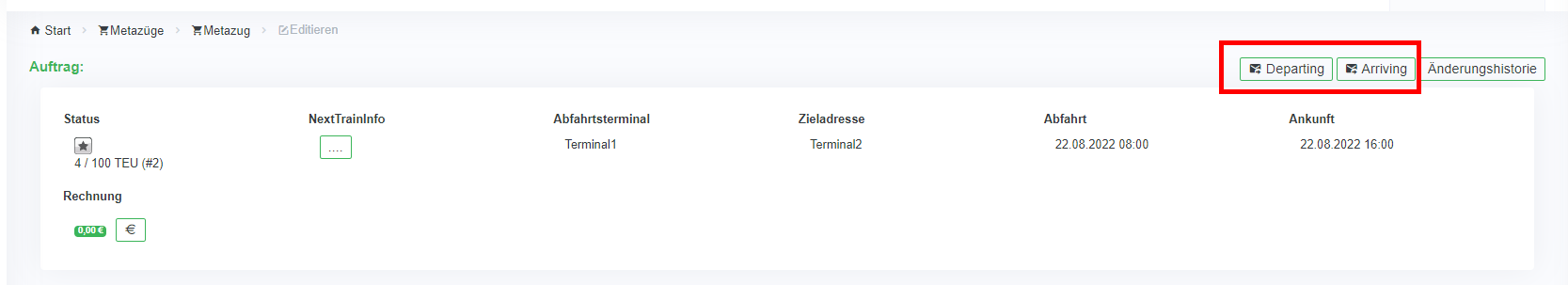 Über die Felder „Departing“ und „Arriving“ lösen Sie automatisierte E-Mails mit den Ladelisten aus. So wird über das Feld „Departing“ an das Startterminal eine E-Mail versendet und über „Arriving“ an das Zielterminal.