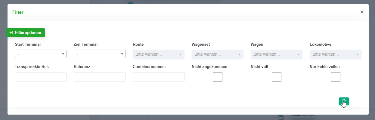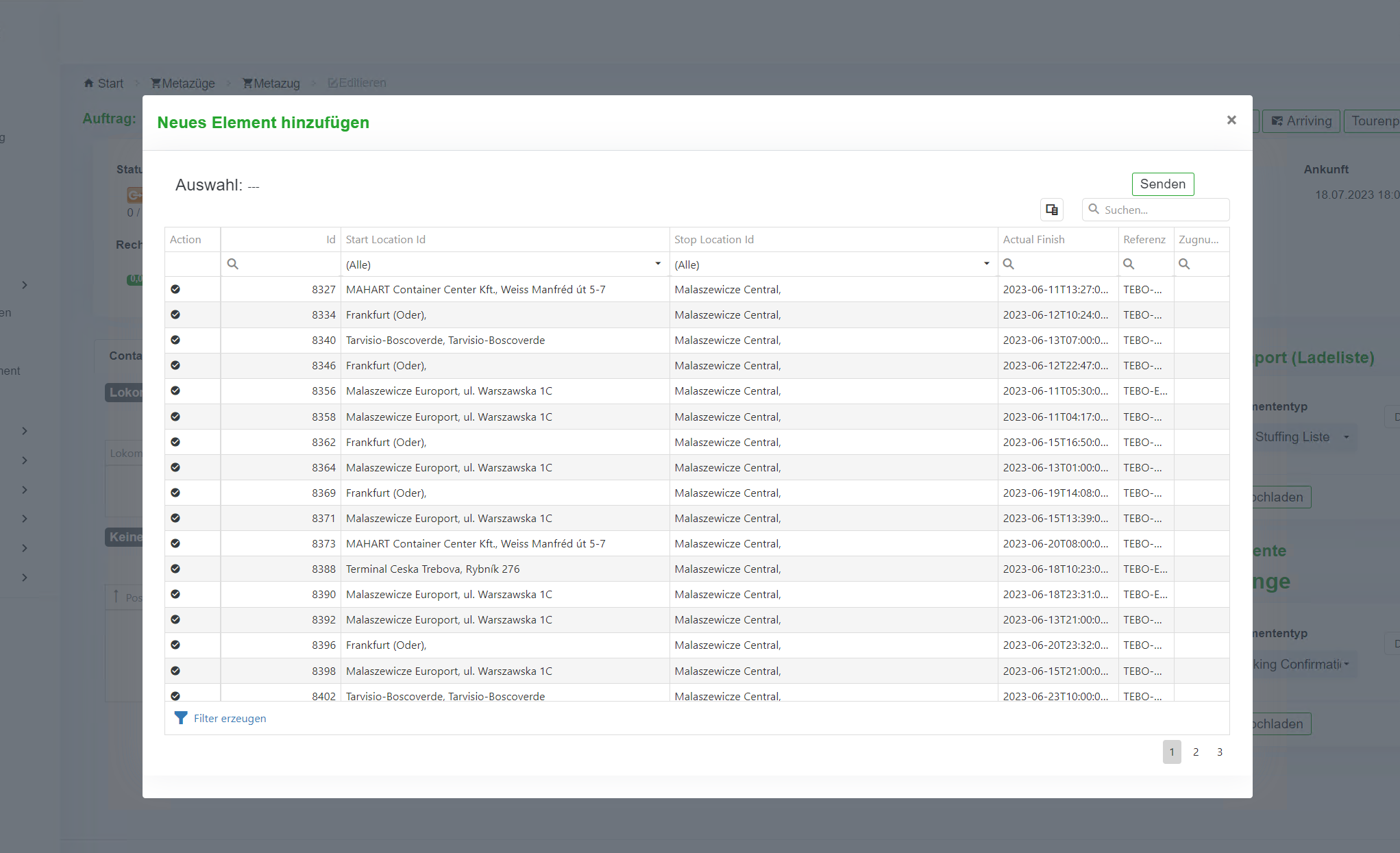 2. Über den Button „Anhängen“ (vgl. Abbildung 11.8 12) öffnet sich ein Pop-up Fenster, in dem alle Container angezeigt werden, die auf der ausgewählten Relation des Blockzuges transportiert werden sollen (vgl. Abbildung 11.8 13).