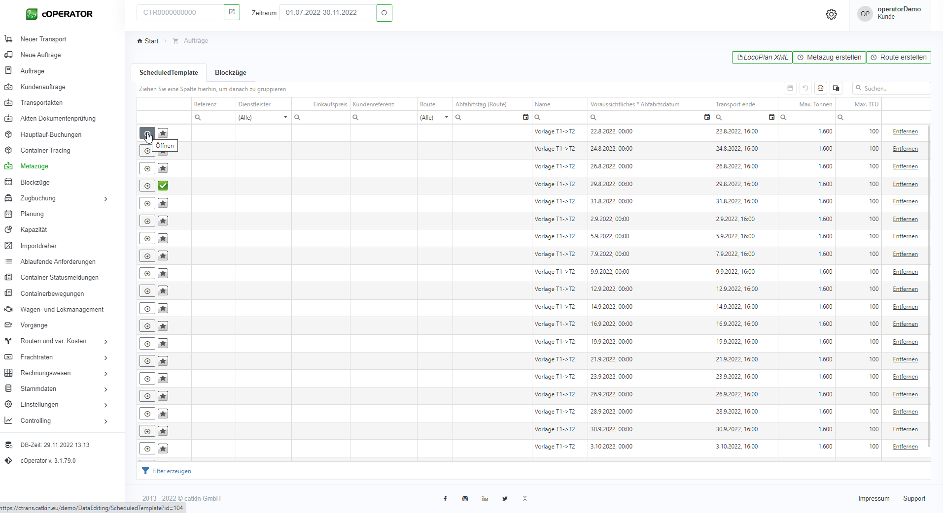 2. Möglichkeit 2 (knüpft an Kapitel Metazüge verplanen an): Rufen Sie im Menü bitte den Punkt „Metazüge“ auf und bleiben Sie im Reiter „Scheduled Template“. Dort können Sie jeden Zeileneintrag sofort bearbeiten und zum Öffnen wählen Sie den entsprechenden Metazug aus (vgl. Metazüge bearbeiten – siehe Abbildung 11.8 4).