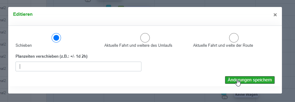 Über den Befehl „Schieben“ öffnet sich das folgende Pop-up Fenster (vgl. Abbildung 11.8‑21), über das Sie die Planzeiten für den aktuellen Blockzug sowie gleichzeitig die folgenden Fahrten des Metazuges verschieben bzw. anpassen können.
