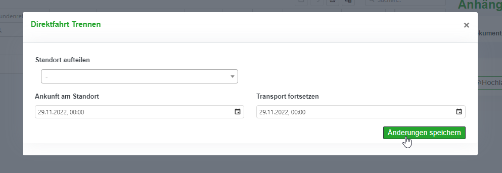 Über den Befehl „Strecke trennen“ öffnet sich das folgende Pop-up Fenster (vgl. Abbildung 11.8‑19), über das Sie die Fahrt aufteilen und die Zeiten anpassen können.