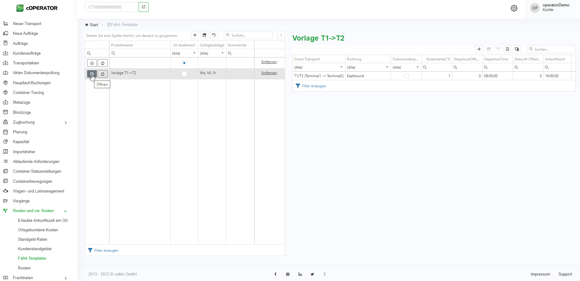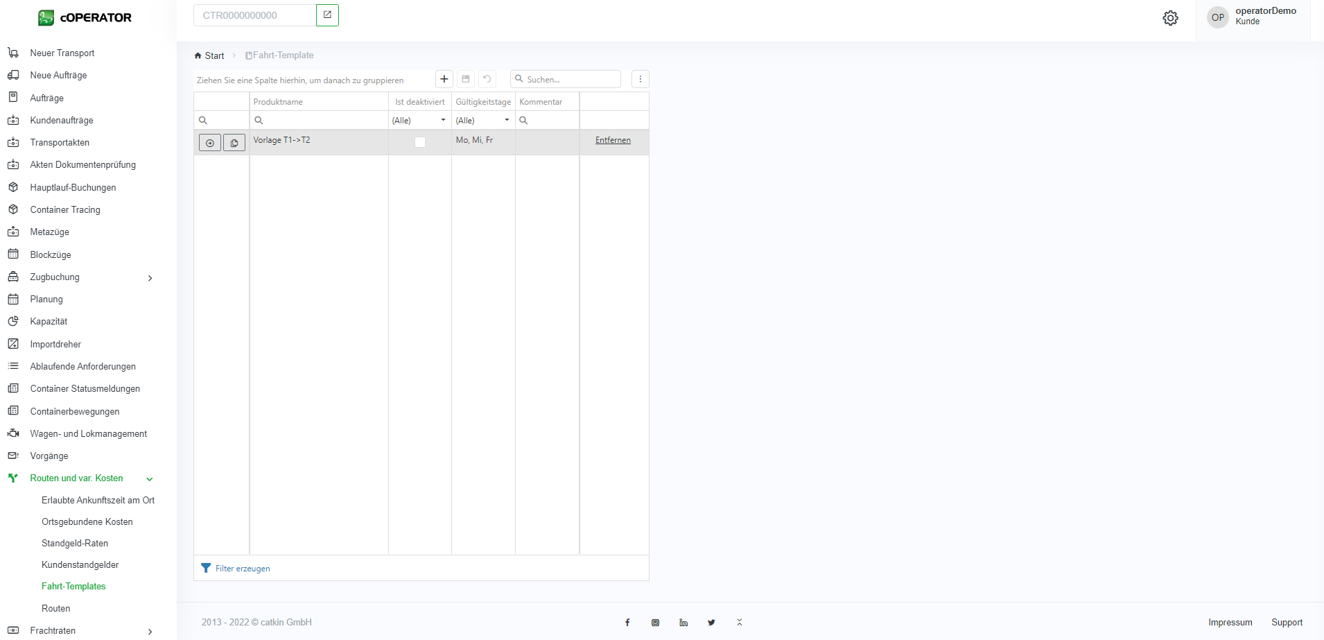 Bevor Ladeeinheiten selbstständig auf konkrete Züge verplant werden können, müssen dafür zunächst Zugverbindungen in den Stammdaten hinterlegt werden. Dieses Menü erreicht man über die Punkte „Routen und var. Kosten“ und „Fahrt-Templates“ (siehe Operative Stammdaten – Fahrt-Templates) (siehe Abbildung 11.1‑1).