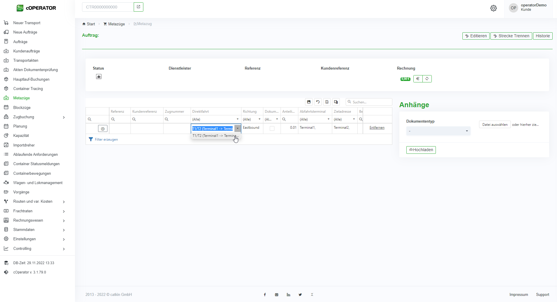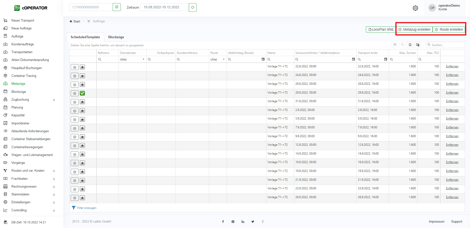 Über den Menüpunkt „Metazüge“ gelangt man in die Übersicht der aktuellen Metazüge bzw. deren geplanten Routen (siehe Abbildung 11.7‑1). In dieser Ansicht planen und verwalten Sie die Metazüge.